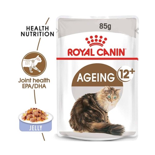As your cat enters its senior years, its body - particularly its joints - will need even more support through nutrition to help maintain overall health. However, along with the changes in the type of nutrition your cat will require, the type of food it instinctively prefers will also change. To ensure that your senior cat (aged 12+) receives the specific nutrition it needs to help maintain optimal health, you will also need to feed it a diet that it will consume naturally and preferentially. Essentially, the right nutrition will only be able to support optimal health if it is within a food that is precisely crafted for regular and instinctive consumption. That's why ROYAL CANIN® Ageing 12+ in Jelly is formulated to match the optimal Macro Nutritional Profile that is instinctively preferred by ageing cats like yours. The joint health of senior cats is paramount to their ability to partake in physical activity and maintain good overall health - which is why they typically need higher levels of nutritional support. ROYAL CANIN® Ageing 12+ in Jelly provides senior cats with specially formulated food to help maintain healthy joints through a high level of Omega-3 fatty acids - specifically EPA and DHA. ROYAL CANIN® Ageing 12+ in Jelly also contains an adapted phosphorus content to help support healthy kidney function and overall renal health. To cater to each cat's individual preferences, ROYAL CANIN® Ageing 12+ is also available in a delicious gravy, or as dry food with tasty and crunchy kibble. If you're considering mixed feeding, simply follow our feeding guidelines to ensure your cat gets an accurate amount of both wet and dry food for optimal benefit. At ROYAL CANIN® we're committed to providing nutritional solutions to your pet's needs. All of our products undergo an extensive quality control process in order to guarantee the optimum quality of food as well as catering to your cat's specific dietary requirements and lifestyle. This means that when your cat eats ROYAL CANIN® Ageing 12+ in Jelly, it's getting a complete and balanced diet.