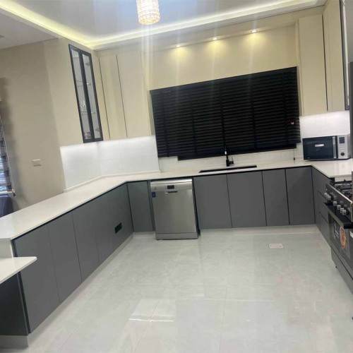 Spanish Laminate Wood Kitchen with Quartz Countertop