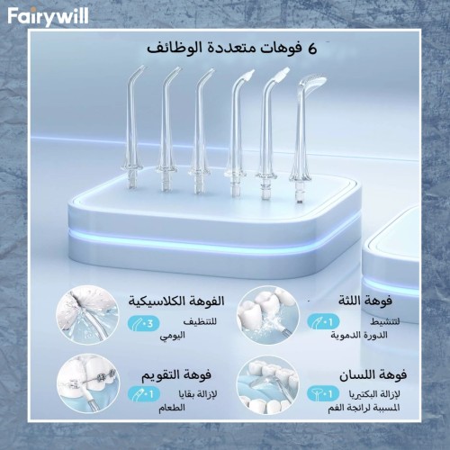 Cleaning nozzles (*3 for cleaning between teeth *1 for cleaning the tongue *1 for cleaning the braces *1 for massaging the gums)
