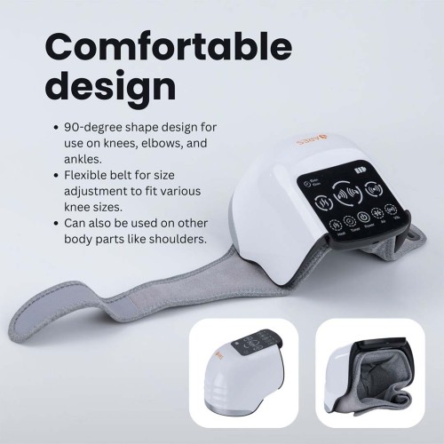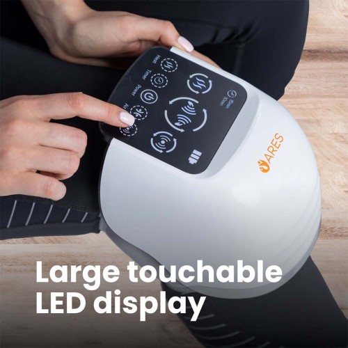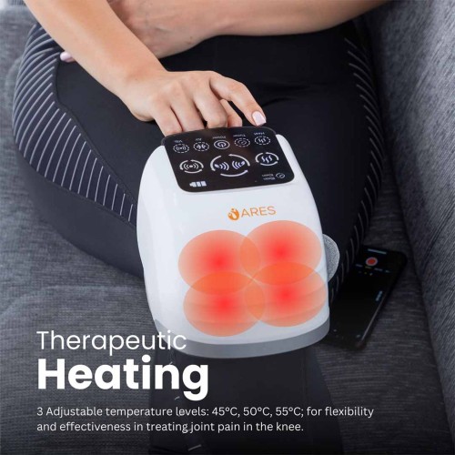 "The ARES uKnee Massager is designed for flexibility and effectiveness in treating joint pain in the knee and various parts of the body, providing a combination of heat, compression, and vibration therapies for comprehensive relief.