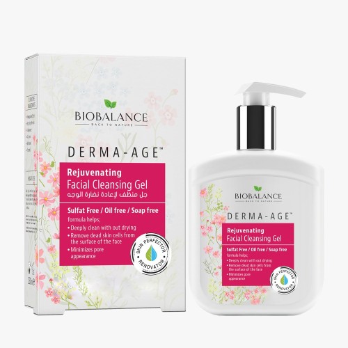 BIOBALANCE DERMA-AGE REJUVENATING FACIAL CLEANSING GEL GEL This formula is Rich in Antioxidants and containing UVA&UVB Filters. It is best for treating dull, tired appearance, fine lines, wrinkles, loss of radiance.