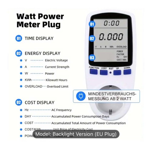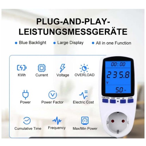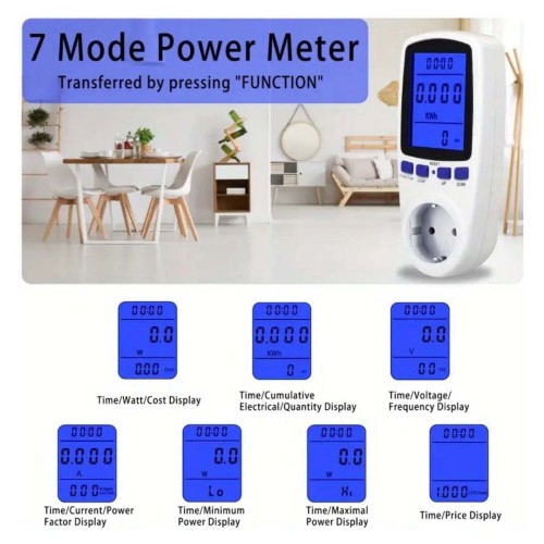 A multifunctional essential device that displays various electrical parameters such as watt-hours (Wh), frequency (Hz), time, and real-time cost.
