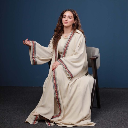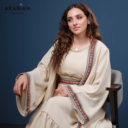 Elegant 3-piece abaya set in a soft beige tone, perfect for both everyday sophistication and special occasions.