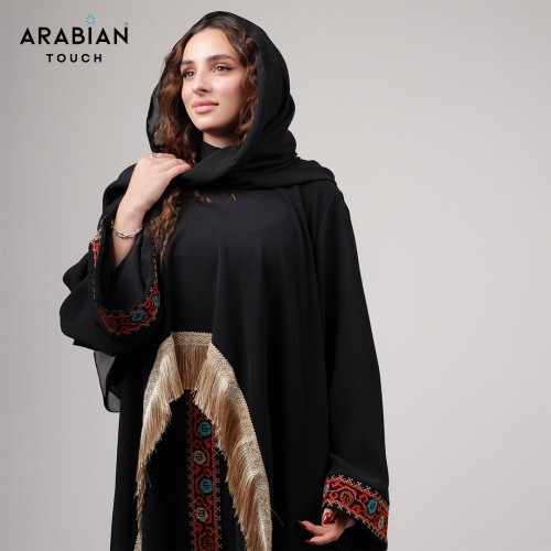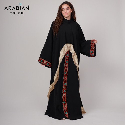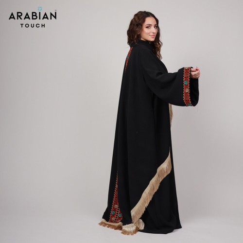 Black Abaya with Gold Fringe & Colorful Embroidery – Japanese CY Fabric