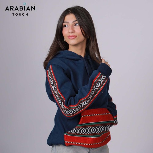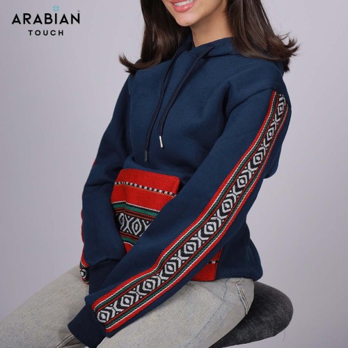 Cozy navy hoodie featuring striking red and black Sadu-style woven trims along the sleeves and a bold matching front pocket.