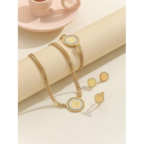 5pcs/set 18kt gold plated stainless steel necklace round plate collarbone chain pattern for women, including necklace, earrings, rings and bracelet
