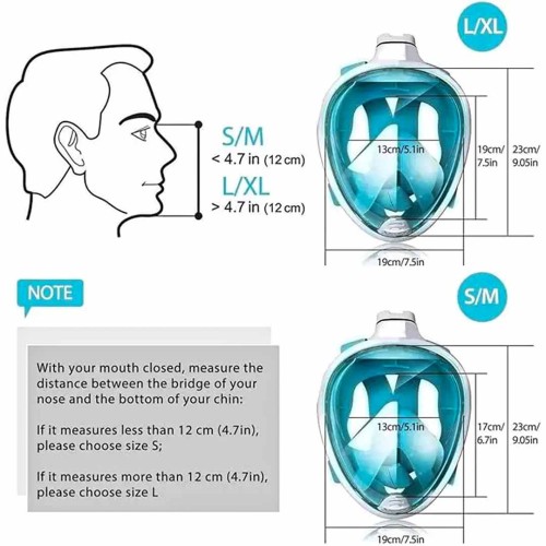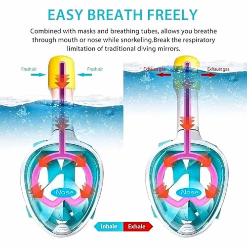 Specially made full face snorkel mask allows you to breathe with your nose and mouth