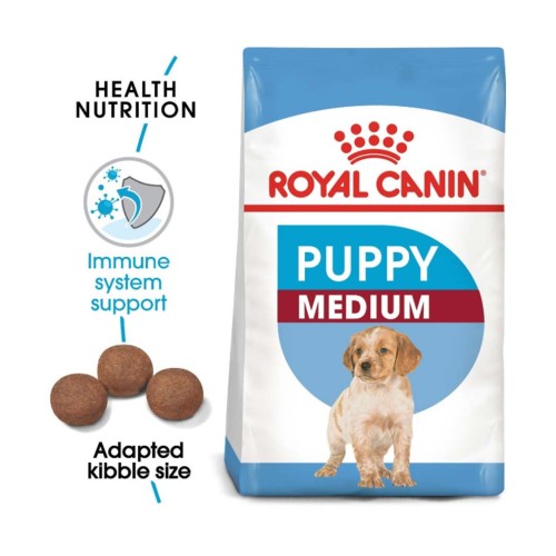 Puppyhood is a time of big changes. During your medium-sized puppy's intense growth period, they need enough calories and the right nutrients to grow healthily. This is a time when your puppy's bones, muscles, senses and nervous system are developing. It's also the period when the antibodies your puppy got from their mother's colostrum weaken, meaning they need optimal protein to build their own immune system. ROYAL CANIN® Medium Puppy is specially formulated to support the nutritional needs of medium-sized puppies. This formula is suitable for 2 to 12-month-old puppies that should reach an adult weight of 11-25kg. This formula contains nutrients such as vitamins C and E to help support the puppies' natural defences while their immune systems are still developing. It is enriched with omega-3 fatty acids (such as DHA) which help to support healthy brain development in puppies. Thanks to a combination of beneficial prebiotics (such as FOS, MOS and beet pulp) and highly digestible proteins, ROYAL CANIN® Medium Puppy also helps to support a healthy balance of intestinal microbiota (gut flora) for good digestion. Additionally, the formula contains an optimal energy content designed to satisfy the energy needs of growing, medium-sized puppies. The kibble in ROYAL CANIN® Medium Puppy has also been specially designed for the mouth of a medium-sized puppy. It's intended to be large enough to discourage bolting, but not so big that a puppy becomes reluctant to eat. It also helps to support dental health, thanks to a mechanical brushing effect as your puppy chews. Did you know that a puppy's nutritional needs change as they grow? By the time your medium-sized puppy reaches 12 months old, they will need a diet that's specially adapted to meet their nutritional needs as a grown dog. At this stage, you can transition them onto ROYAL CANIN® Medium Adult, available either as a dry kibble diet or with wet chunks in gravy. At Royal Canin, we're committed to creating a better world for cats and dogs. For more than 50 years, we've worked closely with breeders, vets, and pet experts, sharing specialist knowledge and scientific research to create a dedicated approach to individualised, precise nutritional solutions. All of our products undergo an extensive quality control process to guarantee the optimal quality of food. When your medium-sized puppy eats ROYAL CANIN® Medium Puppy, they're getting a complete and balanced diet.