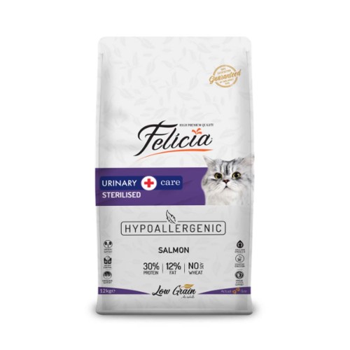 Felicia Urinary Care Sterilized - Hypoallergenic Salmon Cat FoodFelicia Urinary Care is a premium hypoallergenic cat food specially formulated for sterilized adult cats. With salmon as the primary protein source, this recipe supports urinary health, weight control, and overall well-being. Its low-grain formula ensures gentle digestion and provides balanced nutrition tailored to sterilized cats.Key Features:Urinary Health Support: Designed to maintain a healthy urinary system and prevent urinary issues.Weight Control: Balanced protein (30%) and fat (12%) levels help maintain an ideal body weight.Sensitive Digestion: Formulated for easy digestion, ensuring maximum nutrient absorption.Omega-Rich: Includes Omega-3 and Omega-6 fatty acids for a healthy skin and shiny coat.Hair & Skin Support: Promotes a soft, glossy coat and supports overall skin health.Low-Allergen Formula: Free from wheat, soy, and artificial additives for a clean, safe diet.Immune System Boost: Enriched with vitamins and minerals to enhance your cat’s natural defenses.Intended Use:Ideal for sterilized adult cats requiring urinary support and weight management.Feed according to the recommended portion size based on your cat’s weight and activity level.