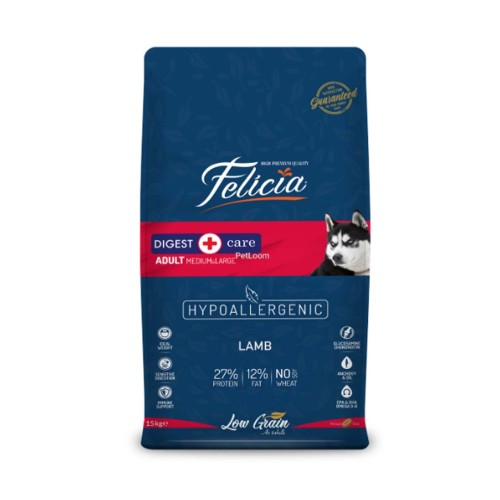 Felicia Digest Care Adult with LambLow Grain & Hypoallergenic | LambAdult Dog Food (For Medium and Large Breeds)Felicia® Digest Care Adult Lamb is a premium formula designed specifically for sensitive adult dogs of medium and large breeds. This carefully crafted recipe blends real lamb protein and rich anchovy content to meet the unique nutritional needs of large breed dogs, ensuring they live a healthy and active life.Key FeaturesHigh-Quality Protein: Contains optimum protein from real lamb meat to support muscle maintenance and overall health.Joint Health Support: Enriched with high levels of glucosamine and chondroitin to protect joint health, especially for large breeds prone to joint problems.Healthy Skin & Coat: Omega-3 and Omega-6 natural fatty acids promote vibrant, silky, and shiny fur while maintaining healthy skin.Sensitive Digestion: Specially formulated to ensure gentle digestion and improved nutrient absorption.Dental Defence: Supports dental health to reduce plaque and tartar buildup.Immune Support: Fortified with essential vitamins and minerals to strengthen the immune system.Natural Ingredients: Free from wheat, soy, and artificial additives for a clean and hypoallergenic diet.Felicia Digest Care Adult with Lamb is crafted to provide the ideal balance of nutrition, taste, and health for your medium and large breed dogs, supporting their sensitive needs and helping them thrive.