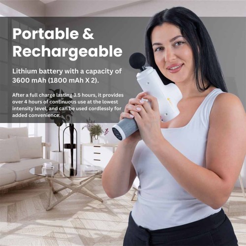 Featuring a rechargeable lithium battery with a capacity of 3600 mAh (1800 mAh X 2), this massager can be conveniently recharged using its own cable. After a full charge lasting 3.5 hours, it provides over 4 hours of continuous use at the lowest intensity level, and can be used cordlessly for added convenience.