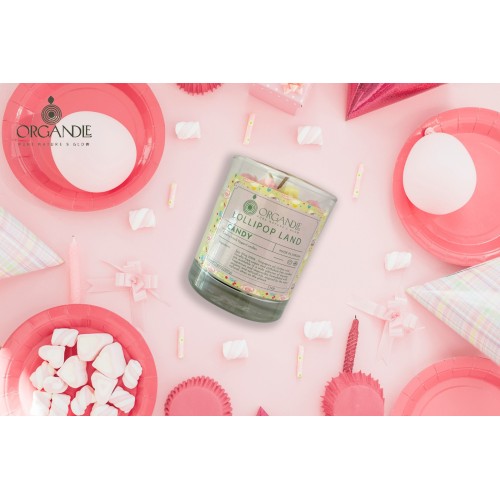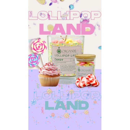 Indulge in a delightful sensory experience with the ""Lollipop Land"" Candy Scented Soy Candle by ""Organdle"". Crafted with care from 100% natural soy wax, this vegan-friendly candle offers a healthy and safe way to brighten your home with a touch of sweetness.