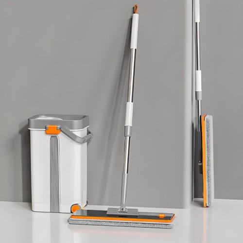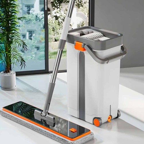 Plastic mop with bucket, designed for effortless and efficient floor cleaning.