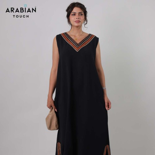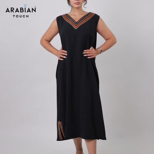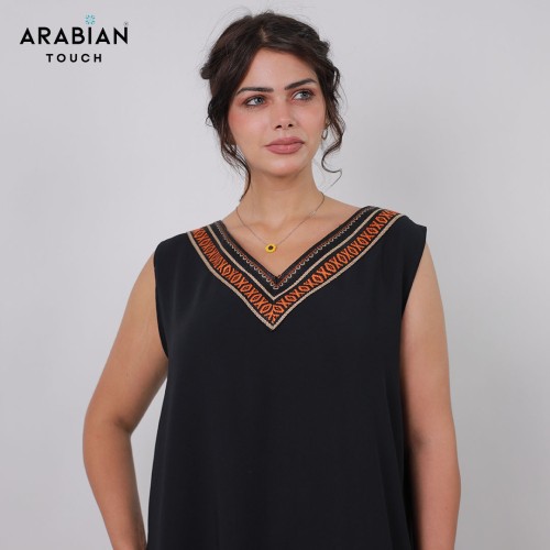 Chic sleeveless black dress featuring an elegant V-neckline highlighted with orange Sadu-inspired embroidery for a subtle pop of traditional detail.