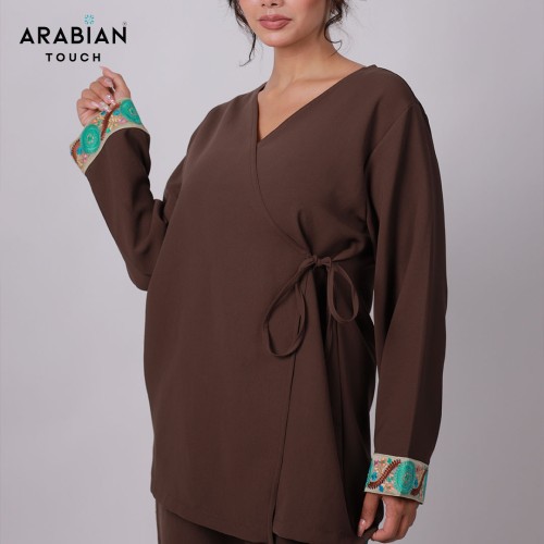 Design & Cut: Wrap-style brown top with waist tie and matching straight-leg trousers. Relaxed, flattering silhouette for casual chic or semi-formal occasions.