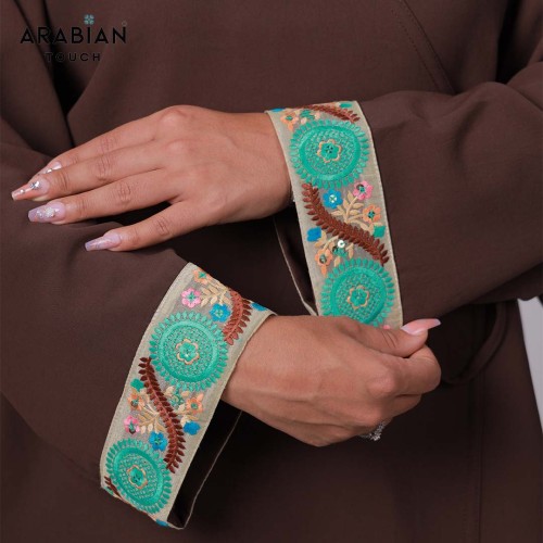 Embroidery Details: Striking turquoise circular motifs with pink, blue, and earthy accents decorate the sleeve cuffs and pant sides, framed by a beige trim for a vivid, artistic touch.