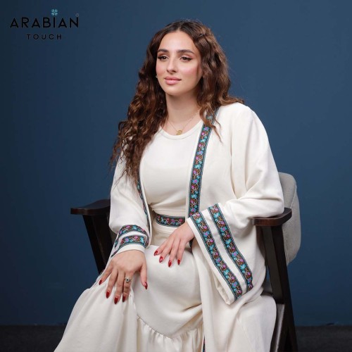 This sophisticated ivory abaya showcases vibrant, multicolored embroidery along the open front, cuffs, and waist belt, creating a striking contrast against the soft off-white fabric. Crafted for elegance and comfort, it offers a flowing silhouette perfect for special gatherings, evening events, or festive celebrations. The intricate embroidered trim adds a touch of artistry, making it a timeless statement piece made from the Japanese CY fabric  for any wardrobe.