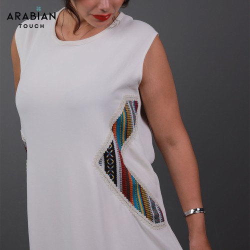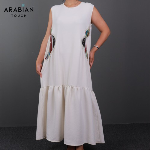A flowing sleeveless maxi dress crafted from a Japanese CY for a soft and breathable feel. This elegant design features vibrant side panels that add a subtle pop of color and artistry, framed with sadu fabric trim. Its relaxed cut and gathered hem create graceful movement, making it perfect for summer occasions, garden parties, or evening outings.