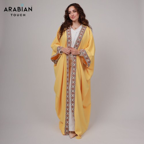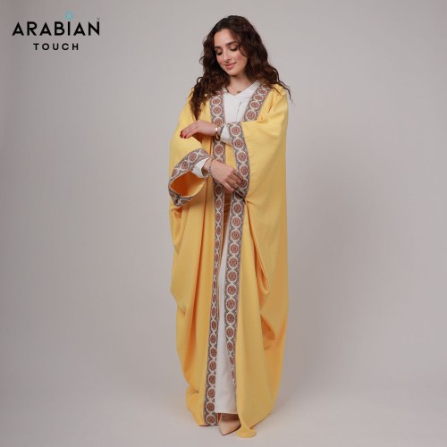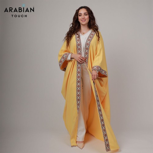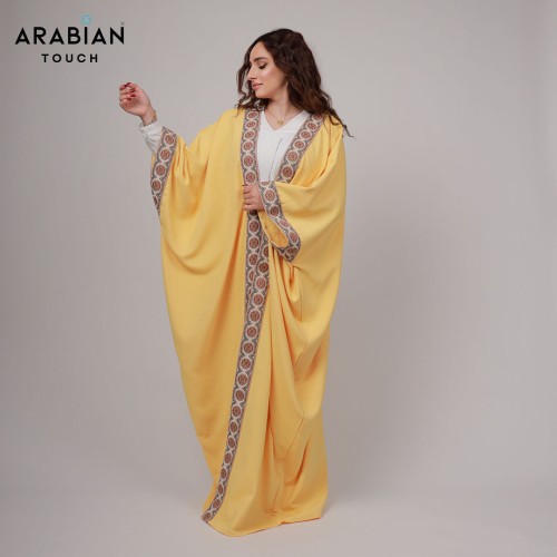 Radiate elegance in this airy yellow abaya, crafted from luxurious Japanese CY fabric for a fluid drape and breathable comfort. The flowing silhouette is beautifully framed with intricately patterned trim in earthy tones, adding a touch of refined artistry to this vibrant piece. Perfect for daytime gatherings or evening occasions, this abaya blends traditional charm with a modern, uplifting hue.